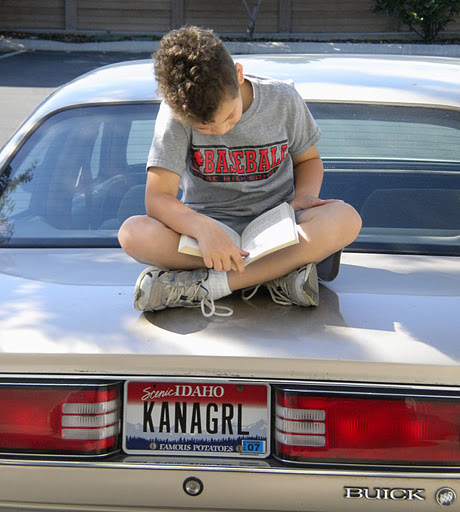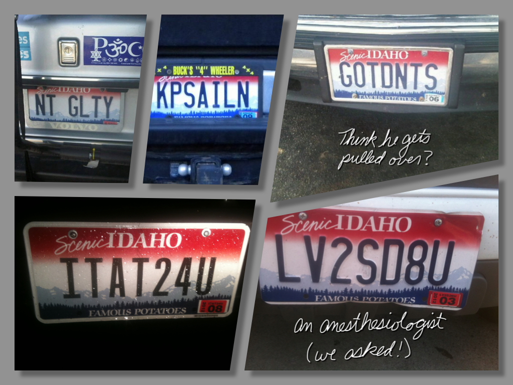 Today’s REAL topic? “Vanity plates.” (Hmm, there may be a subtle subliminal segue somewhere in there…) We’ve been having fun “collecting” personalized license plates this week, so I’ll share the favorites. I’ve mostly ignored the plates of people’s names–personalized, yes, but not so entertaining. (I plead guilty on this one; our plates say KANAGRL. Of course, the back of my husband’s neck also says “Kana Girl”–evidently I have a compulsion for labeling things that belong to me…)