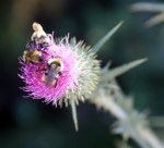 Hawks soar over the Snake River crossing at Walter’s Ferry, and we get out of the car to admire the geological stories evidenced in the volcanic mesas bounding the river, and in the smaller stones underfoot. Keoni enthuses over a rock that shows “at least five different events,” and turns up the blade of an old hay knife in the process. (We have a basket in the backseat which will gradually fill with his findings–he’s a delighted scavenger who sees treasure everywhere.) In the meantime, I borrow his hunting knife to dislodge a few dozen goatheads from the bottom of my shoes; I like my sandals without added traction, thank you.