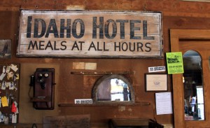 I called yesterday to see about a room at the Idaho Hotel, but we don’t actually know where we’re headed when we pass the sign welcoming us to Silver City and instructing us to report in with the watchman. Happily, it’s not difficult to find anything in Silver City, so a moment later we’re parking in front of the flag-bedecked white porch of the old hotel. The hotel opened in 1863, with additional sections added over the next few decades. Its tidy three-story clapboard front contrasts starkly with its backside view–dark weathered wood teetering five stories (built on a hill, the street-level front entrance opens onto a middle floor) with a crazed roofline of cobbled-together converging ridges. Pushing open the front door, we wander through a large wood-paneled foyer crowded with relics of earlier days and into an even larger dining-room-and-bar. There, framed by the heavy saloon mirror behind him, we find Roger, who owns and operates the hotel and “lives under the stairs” (not quite like Harry Potter).