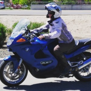 I am pretty stubborn, and I am going to ride well. When a chatting neighbor told me this morning that he’s enjoying my posts, and that “that’s a serious bike” to start riding on, I laughed at myself and answered that I don’t tend to do anything half-assed. (That’s not always a good thing in my life, but for better and worse, it’s true of me.) Today I’m looking forward to my next parking-lot session without the nerves. And someday, I’m going to ride with skills like these: