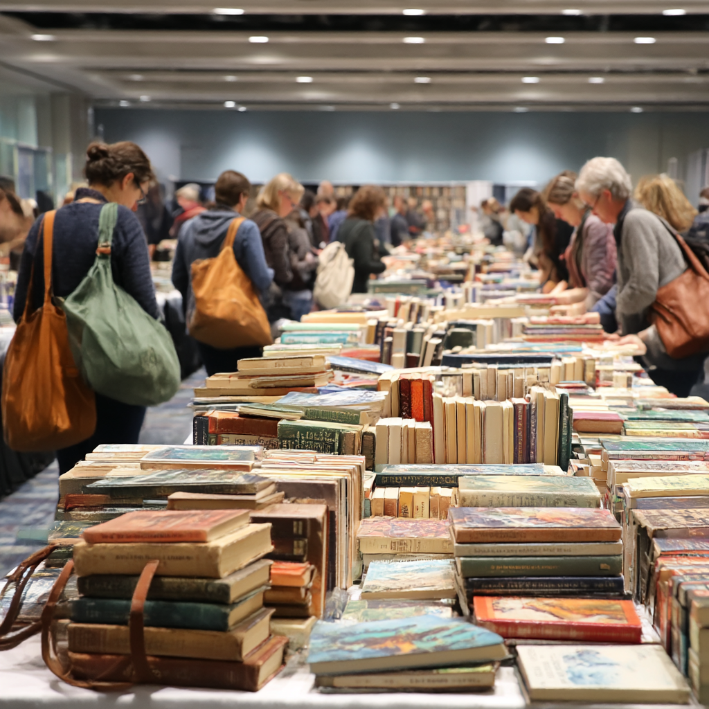 I can’t think of any concert or rally or Black Friday sale that I’d stand in line for, but for the book sale, I was waiting for the doors to open. Chatting with the ladies behind me in line, we noted that you could spot the veteran book-salers by the empty bags we shouldered. (The only thing missing from this book sale is a cat. Every great bookstore has a cat! I could have supplied one, if they allowed a cat-on-leash in the Convention Center…)