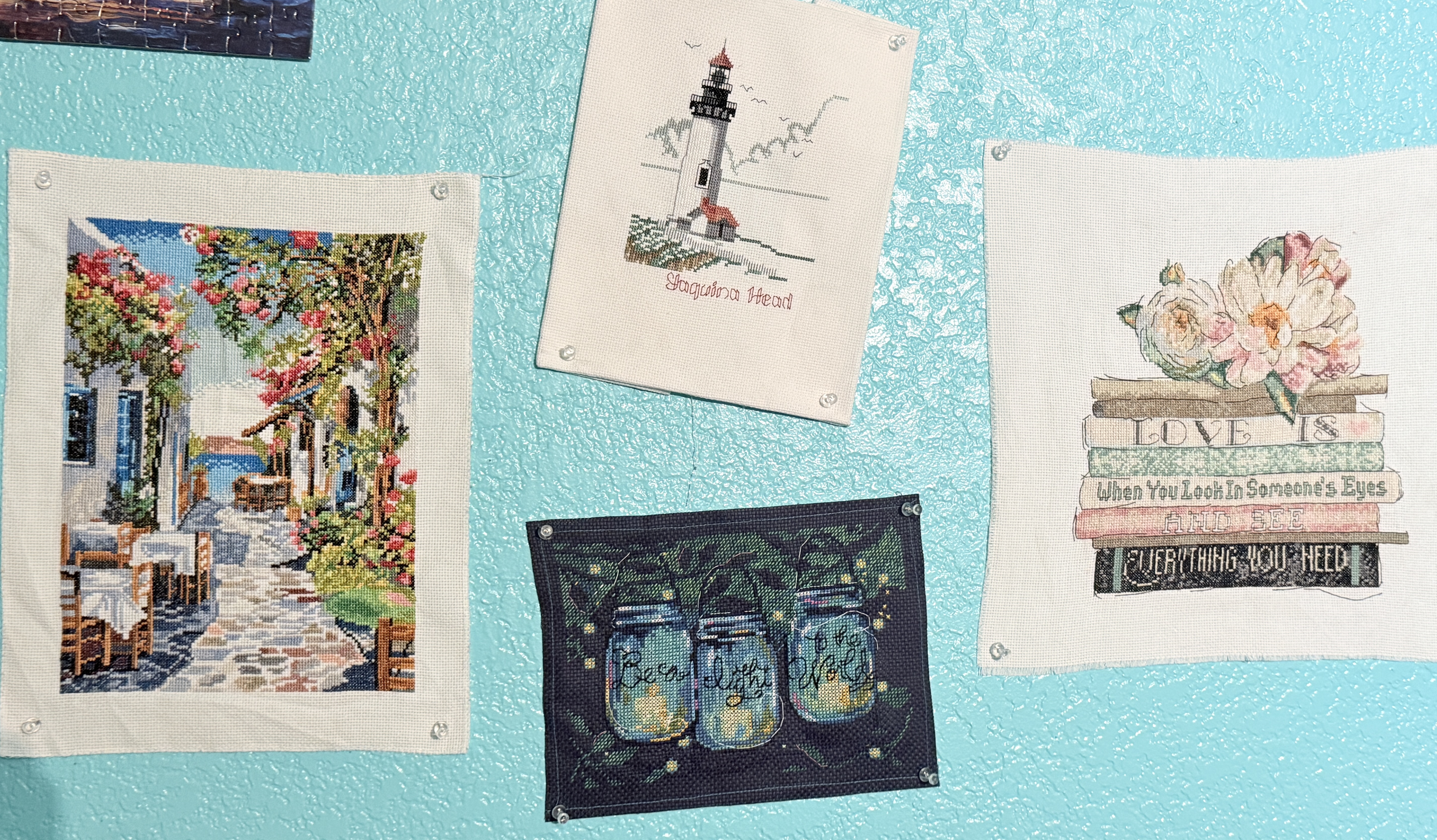 photo of the writer's wall with cross-stitch pictures pinned to it