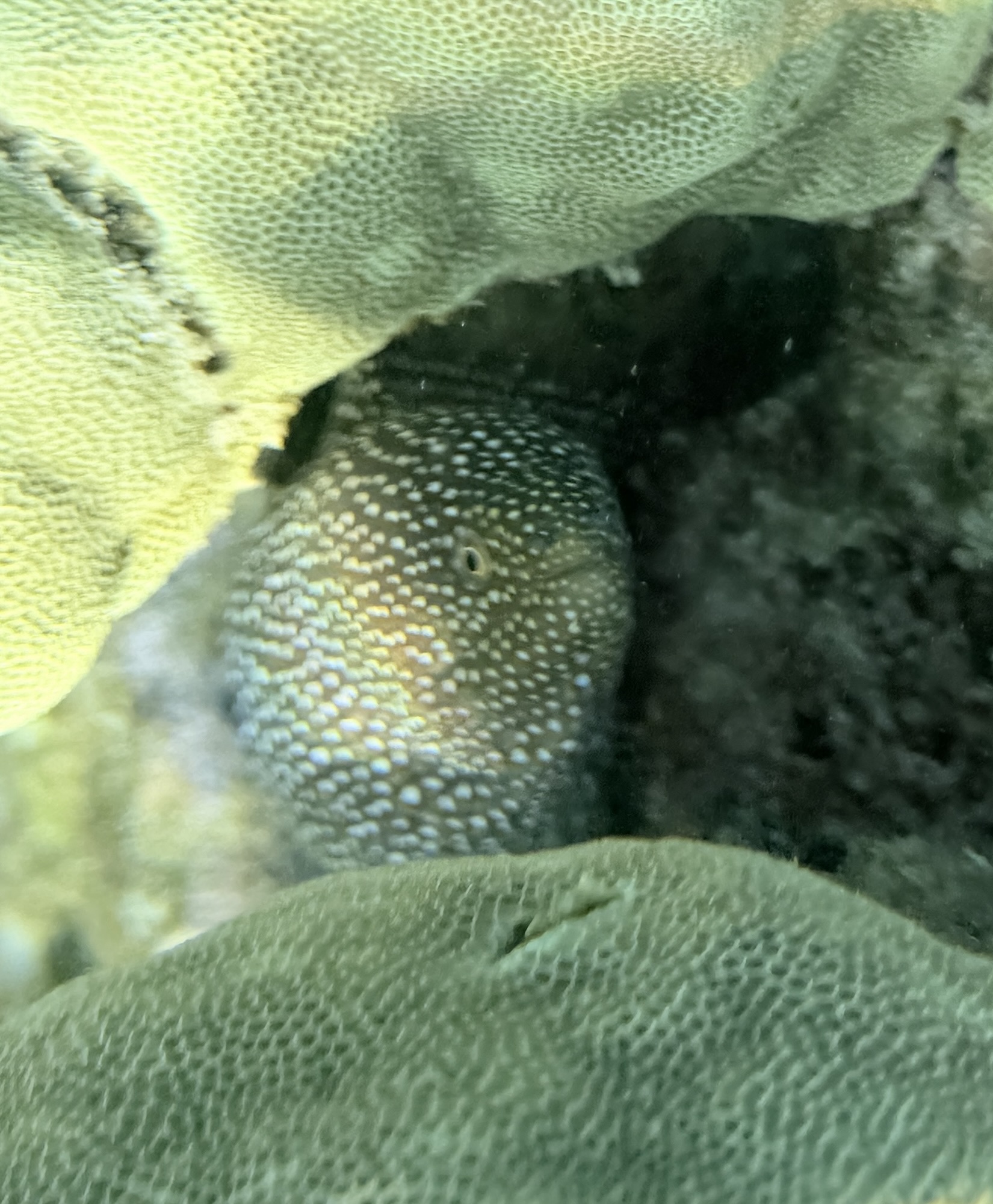 Jon is holding my left hand, and my right hand has the phone in its waterproof pouch, taking photos when I can get it to focus. (Photographically speaking, the pouch is not working nearly as well as the naked phone. I’m going to have to get an underwater case specific to the phone.) A tendril of hair is floating loose in front of my face, escaped from my hair clip. A moment ago, I let go of Jon’s hand and kicked below the surface 15 feet or so, trying to photograph a spotted moray eel that he pointed out, hiding in the lobe coral. I had trouble staying down, though—even with the weight I’ve recently lost, I’m too buoyant—I was kicking downward and unable to hold still enough to get a clear shot. Back on the surface, I blow air through my snorkel to clear the water out, and see a pair of darting Moorish Idols (“Your mom’s fish!” Jon exclaims through his snorkel). I don’t try to chase them for a photo. Right now I’d rather just SEE them, and remember seeing them, than frustrate myself with the unfocused camera. I’m here in the water now, paying attention to being in the water now—and all too soon it will be only memory. My hyper-awareness of it being the last underwater-Now is baked into the memory.