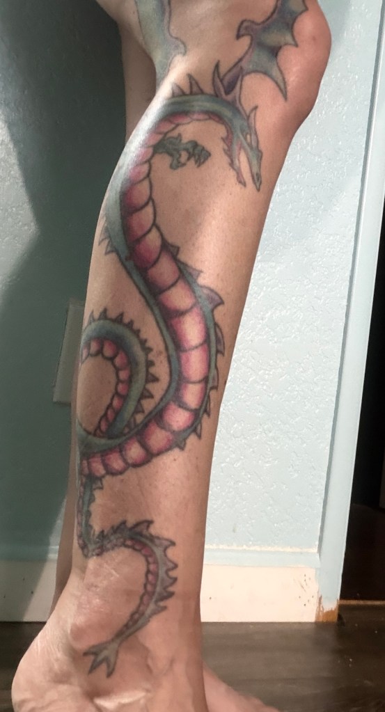 When Christian was eight or nine, I took him with me to my tattoo guy. Devon got out a Sharpie, and drew on my leg as ‘Christian described Dragon, right down to the fingernail-claws and the stubby arms (definitely ill suited to the Backstroke). When Christian signed off on the image, Devon got out the real ink.